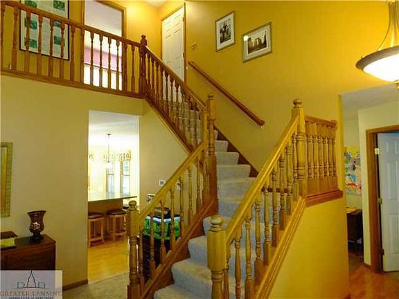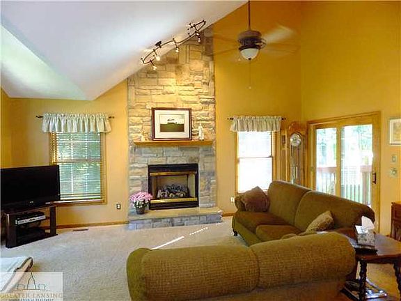 Sit in the Klein Farms Estates Sub. on a gorg./very private 2.45 partially fenced/prof. landscaped parcel/majestic white pine this 3 BR, 2 full/2.5 bath contemp. is immac. Entry is open to a dramatic 2 st. vaulted great room/turned stairway to 2nd level, floor to ceiling stone/gas log fireplace & slider to wrap around deck. Right of foyer is a half bath, mud room/direct access to fin. 2.5 garage/floor drain, hot & cold water. Large island kitch/dbl snack counters, abundant cabinet & counter space/open to sunny dining area/access to deck. 2 nd level has open hallway/overlook's lower level, 2 BR/full Jack-N-Jill bath. Large 1st floor master/walk-in/full bath/ceramic floor/ jet tub/separate shower/solid surface vanity. Daylight lower level, includes lndry, craft/exercise room/ ? bath, privat office & a fabulous 42' X 16'5'' recreation room/several daylight windows, built ins, granite kitch/wet bar/wine cooler. (The ultimate entertainment center) Built with energy savings in mind, low utilities/home has high eff. furnace, tankless water heater/closed cell foam insulated walls, R-45/R-48 attic. Other features & amenities include natural gas, cable, play equipment/additional decking, 200' concrete drive & the ultimate, Mortan Pole Barn, fully insulated, finished, 35' X 58' with 16' walls. Frost free water, 50 yr. paint warranty, 220 amp service, 2 industrial fans, stubbed for natural gas furnace. There is also a whole house nat. gas backup generator. Country setting, yet only 2.5 mi. to 69 & 96, 6.9 mi. to airport, 13 mi to MSU.