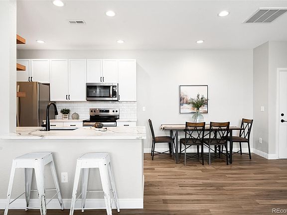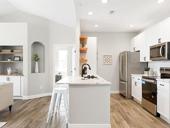 This beautifully updated top-floor residence in City Center North offers stylish living in a coveted location. An open floor plan is illuminated with natural light from large windows throughout. With over $100,000 in recent renovations, almost every detail has been expertly upgraded for modern comfort and style. Vaulted ceilings create an airy ambiance, while the spacious living room features built-ins, a cozy fireplace, and access to an east-facing balcony. The sleek kitchen boasts stainless steel appliances, all-white cabinetry with sturdy black hardware, an undermount sink, and contemporary quartz countertops. Underfoot, COREtec® Plus waterproof luxury vinyl flooring provides both elegance and durability throughout the home. The primary bedroom includes a private en-suite bath. A dedicated laundry area adds convenience. A rare highlight of this home is the inclusion of two detached 1-car garages—an almost unheard-of feature in this community—plus two additional parking permits, and a guest parking pass. Residents enjoy access to a community pool, and a prime location near the light rail, Fitzsimons Medical District, Aurora Mall, and Buckley Air Force Base.
