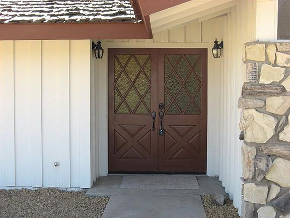 Charming 5 bdrm, 2 bath split floor plan home with 2 fireplaces with a gas log lighter. One side of the home features a master retreat, a pocket-door leads to the hallway with master bedroom, bath and additional room that can be used for an office or den. This home is an entertainers dream, kitchen has tons of countertop space and cabinetry with a window looking out to the pool. The formal dining room features beamed ceilings. The yard is desert landscaping for low maintenance with a rocked circular drive in the front. Chain linked fencing around the property, double gates on both sides of the house to store your toys, rv, boat, etc. The garage is completely finished and large newer storage shed in the back. Sparkling pool with a covered patio. Too many amenities to mention, go see as this one won't last!