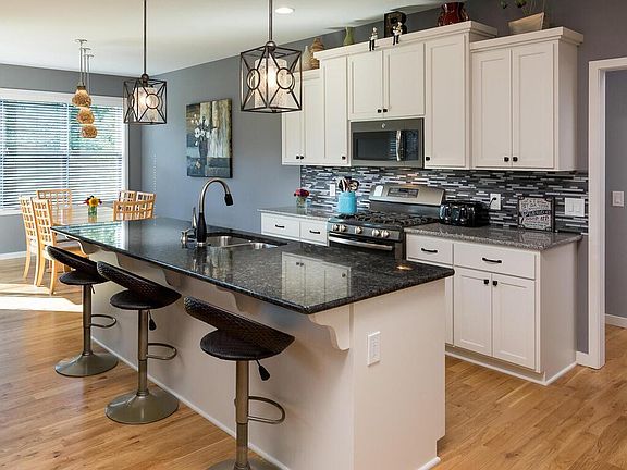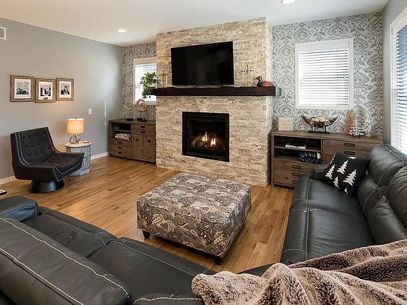 This walkout rambler with views of Jeffers Pond is nothing less than IMPRESSIVE! Located on a quiet cul-de-sac with paved walking paths steps away. You'll be amazed with the custom finishes throughout the home including beautiful LL mesquite flooring, shiplap walls, barn doors, fabulous lighting, tile and heated floors in the master and LL bath. Main level features a great room with gas fireplace and a stone surround flanked by windows. Informal dining area has great views! Spacious master bedroom w/private full bath and large walk-in closet. Lower level offers multiple entertaining spaces with a huge family/theater room, game area, wet bar with custom fold-away table, quaint playroom under the stairs, 2 bedrooms, & large 3/4 bath. Outside, enjoy the nature views on the maintenance free deck or LL paver patio. Wonderful landscaping and an extra wide heated garage with floor drain!