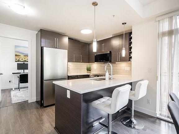 Discover the perfect blend of COMFORT & CONVENIENCE in the prestigious Latitude, a community thoughtfully designed by award-winning HR Architects. Spacious 1,037 sqft 3 Bed 2 Bath corner unit offers a unique resort-like feel, featuring wide corridor access and tranquil views of the indoor garden and green space from two private balconies. The bright, open-concept layout is enhanced by 9-foot ceilings, floor-to-ceiling windows, and laminate flooring throughout. The modern kitchen includes quartz countertops, stainless steel appliances. 2 side-by-side parking & 1 Storage locker. Indoor/outdoor amenities, including a fitness center, clubhouse with kitchen and pool table, playground, garden, and courtyard. Close to schools, YMCA, shopping, transit, and offering easy access to Hwy 91 & 99.