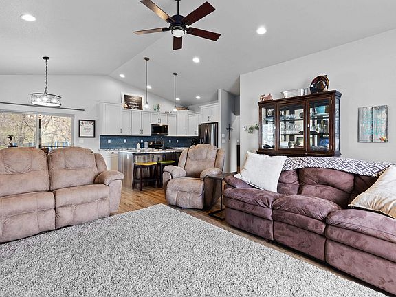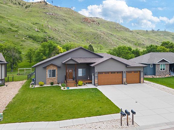 Get ready to fall in love the moment you arrive at this stunning home in Summerset, SD! Nestled on a quiet cul-de-sac and surrounded by serene hillsides, this home is a true showstopper from the very first glance. The elevated covered entrance with Trex decking sets the tone for the stylish and inviting spaces inside. With over 3,200 sq ft, this open-concept ranch-style home offers soaring vaulted ceilings in the great room and a cozy gas fireplace that instantly feels like home. The kitchen is a perfect blend of timeless charm and modern elegance—featuring warm white cabinetry, rich wood accents, granite countertops, a chic tile backsplash, and a spacious pantry for all your storage needs. Three main-level bedrooms include a tranquil en suite with a tiled walk-in shower and a generous walk-in closet. Intentionally designed to be cozy and functional Thoughtfully wide hallways add comfort and accessibility, a feature you may have not realized you needed. Downstairs, unwind in the large family room, enjoy the added flex room, and take advantage of the abundant storage space. Love to tinker or play? The fully finished, heated garage is ideal for a golf simulator or workshop. End your day on the covered Trex deck, soaking in the peaceful views and soothing sounds of Elk Creek. This home checks all the boxes for comfort, style, and location!
