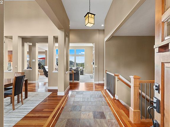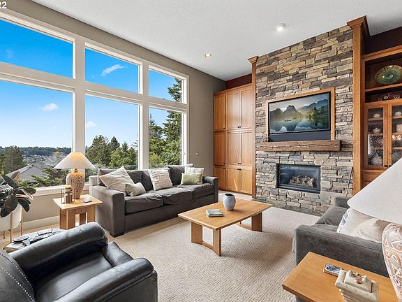 Gorgeous Custom NW Contemporary w/Craftsman vibe. Wall of windows in great room captures the BEST Views in Happy Valley! Floor to ceiling stone fireplace;primary ste on main;large great rm living, formal dining, guest rm/office/den & 2nd full bath on main level as well! Newer kitchen wt slab counters & tile backsplash, updated tile floors in LL bath & laundry; blt-in butlers pantry/bar & High ceilings. Storage galore! Expansive decks & lovely stone patio. So much more! An Entertainers delight!