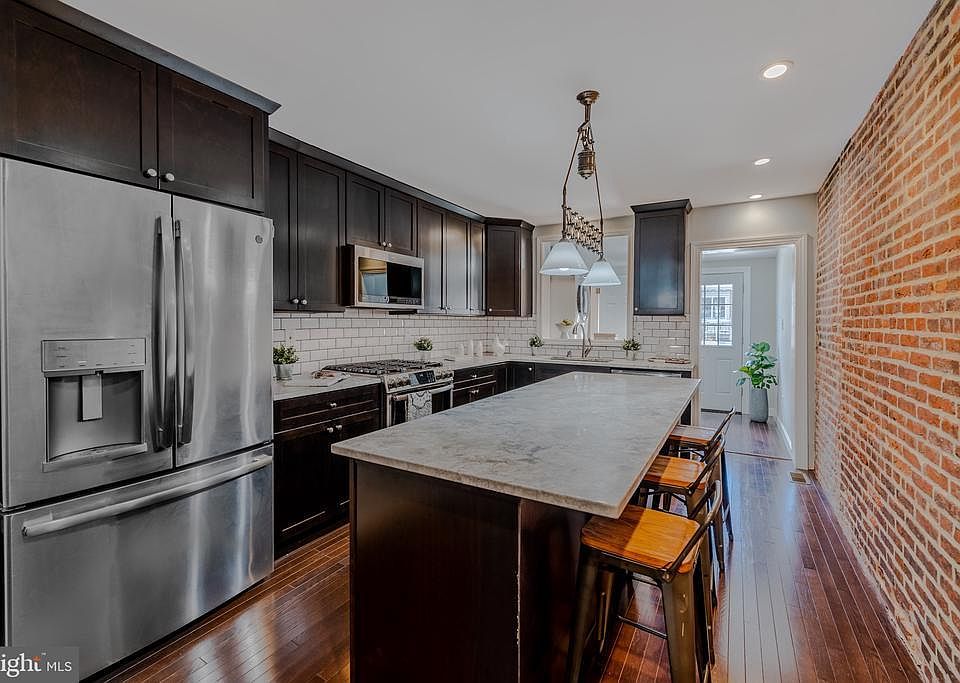 Gorgeous recent renovation of a larger than typical Locust Point rowhome. Look no further! Andre is an awesome tree lined non-thru street in Locust Point with easy access to Latrobe Park, Fort McHenry, and the interstate with an on-ramp at the end of the block. Completely renovated, this 2 br, 2 1/2 bath home features exposed brick walls and gleaming dark wood floors throughout. The oversized kitchen has beautiful espresso wood cabinets and light granite counters. The large uninterrupted island has a wine cooler at one end and room for many guests to sit and chat while you prepare a feast. Stainles steel appliances include a French door refrigerator with ice/water in the door. The kitchen is open to a nice sized dining area. Behind the kitchen is a wonderful mud/laundry room with a half bath. There is plenty of room to park bikes or a stroller. The concrete parking pad out back is easy to navigate. The second floor has a generous owner's suite on the rear with a walk-in closet and a sliding door to the roof deck. The owner's bath features a custom stall shower with niches for shampoo bottles, a heavy glass shower door, a double sink vanity, and a skylight. The front bedroom has easy access to the hall bath with a tub/shower and vanity. The unfinished basement has a concrete slab in the front portion and dirt crawl space in the rear. This location is really terrific- just a short walk to Fort McHenry or the dog park. The highway access at the end of Andre allows for a nearly non-stop drive to University Hospital due to the extremely long access ramp (quite amazing actually- like chutes and ladders!) and super easy access out of the city to DC or elsewhere. Great shopping, restaurants, breweries, and coffee shops nearby. McHenry Row is a quick walk and Federal Hill a little further. Blink and this will be gone!