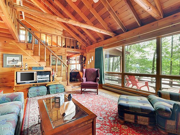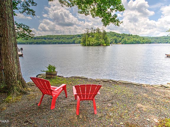 LAKE WALLENPAUPACK Gumble Lakefront at Burns Island in Lakeland Colony w/75' frontage & gorgeous island views PLUS a .23 parcel back lot - perfect for garage. This 2-3 Bedroom, 2 full bath home is immaculate w/classic Gumble features: field stone fireplace, T&G ceilings & walls, HW floors, signature chestnut railing on the staircase & additional guest space in the loft. The finished lower level has a family room, laundry area, authentic built-in shelving & cabinets & a walk-out slider to the patio. Outside features a wrap-around deck & a shed for storage w/elec. The location on the lake is ideal - protected from boat traffic and just a swim to the island. Everything in home included. Lakeland Colony includes access to 350+ acres of private land to hunt, hike & ATV. Dock permit for 20'x40'., Beds Description: 1 BED 2nd, Beds Description: 2+Bed1st, Beds Description: 1 BED 2nd, Baths: 1 Bath Level 1, Baths: 1 Bath Level 2