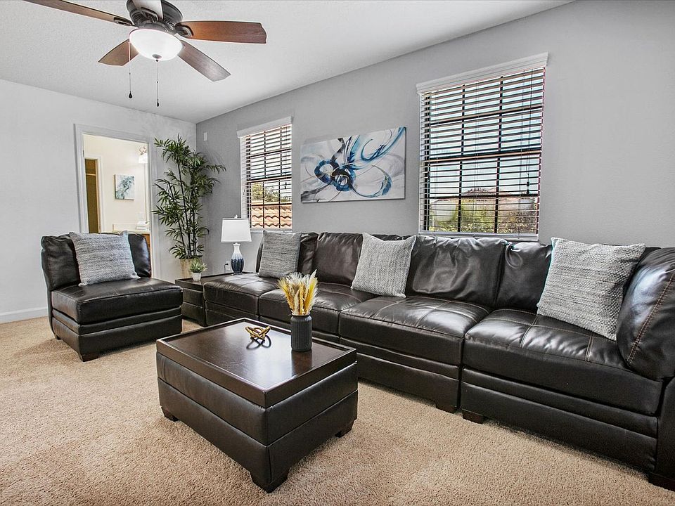 Welcome to this exquisite 5-bedroom, 4.5-bathroom vacation pool home located in the prestigious ChampionsGate Resort. This private retreat offers a north-facing pool with a spa, a game room featuring a pool table, ping pong, and air hockey, and is nestled within a gated community just 10 miles from Disney World. The fully equipped kitchen provides seating for 10 at the dining table and 4 at the breakfast counter, making it perfect for family gatherings. This home is designed with families in mind, offering a spacious and fully equipped kitchen, a cozy living area, and a game room for entertainment. The bedrooms are thoughtfully arranged with a master suite on the first floor featuring a king bed and an attached bathroom. The second floor hosts another master suite with a king bed and attached bathroom, a bedroom with two twin beds, a bedroom with one twin and one double bed, and a bedroom with a king bed and shared bathroom. For an additional charge of $30 per day plus tax, guests can opt to heat the pool and spa. The resort allows a maximum of 5 cars or 3 large passenger vans, with visitor parking capped at 10 cars per property. Additional rental items such as BBQs, cribs, pack-n-plays, strollers, and high chairs are available upon request. ChampionsGate Resort is ideally located, providing easy access to major attractions and shopping destinations. It's just 10 miles from Walt Disney World, 21 miles from Universal Studios, and 18 miles from SeaWorld. The Orlando Airport is 30 miles away, while both Atlantic and Gulf Coast beaches are within an 80-mile drive. Local conveniences include a Publix Supermarket 2 miles away and dining options within a short distance. This property is smoke-free and pet-free for your comfort. Towels and linens are provided, and complimentary Wi-Fi is available. Guests can enjoy free on-site parking and access to resort amenities without additional resort fees. Check-in is streamlined with online email access, and 24/7 on-call maintenance is available. A starter welcome packet is provided, but guests are responsible for replenishing supplies beyond the initial provision.