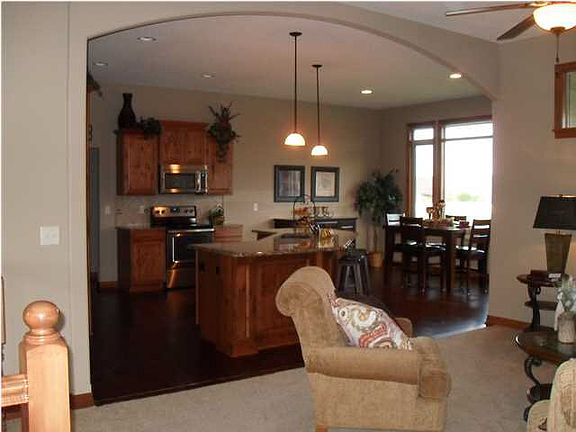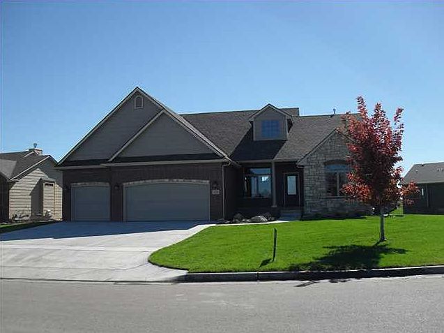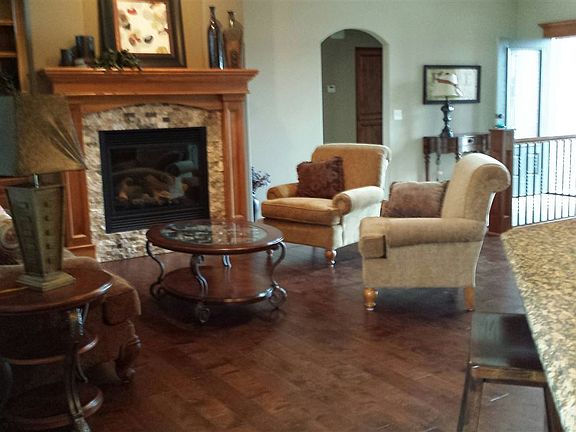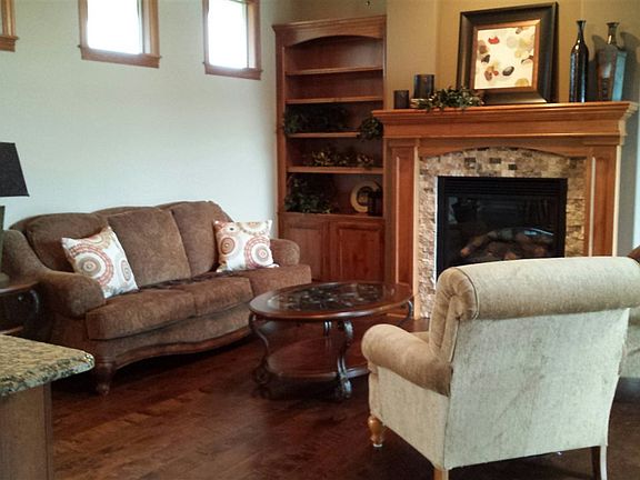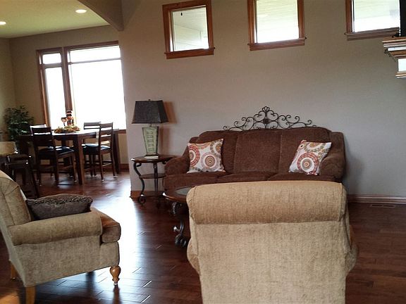 WOW WHAT A DEAL! THIS FORMER MODEL HOME IS PRICED THOUSANDS LESS THAN THE COST TO REBUILD IT AT TODAY'S PRICES AND THE SPECIAL TAXES PAY OUT IN LESS THAN 9 YEARS! THIS VIEWOUT HOME OFFERS EASY ACCESS WITH ONLY 2 STEPS TO THE FRONT PORCH! Offerring an open main living area w/10' ceilings & handscraped wood floors!. Huge kitchen isle overlooks a large dining area, covered deck & Living Rm Fireplace! Hidden walk in pantry offers plenty of storage for kitchen things, & beautiful knotty alder cabinetry with granite counters make cooking meals a pleasure! Master suite offers a walk in closet w/seasonal racks at ceiling level, separate shower, whirlpool tub, double vanities & door from main floor laundry to Master closet. The basement is finished with a big family room, wetbar, bdrm #4 & 3rd bath. There is room to finish bdrm #5. The safe room under the front porch area will keep you safe during tornado season & can be used for wine storage! The front of this lovely home is adorned with brick and tumbled stone and overlooks the area lake. BUILDER WILL CONSIDER OWNER CARRY OR LEASE PURCHASE TERMS, OR WILL CONSIDER TAKING YOUR SMALLER HOME IN ON TRADE!