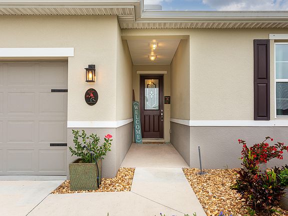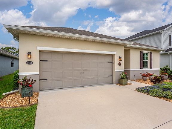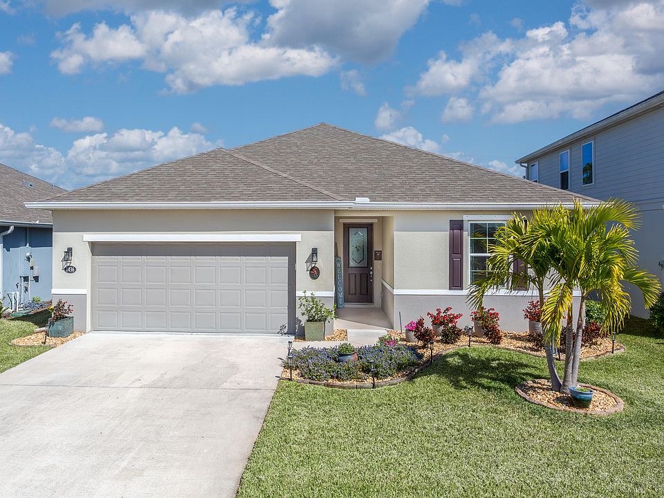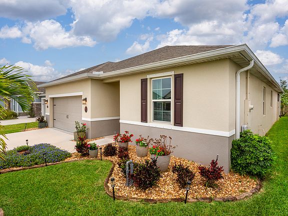 BETTER THAN NEW - no added expenses required! You already have: fenced yard, extended screened patio, pendants, ceiling fans, sprinkler system, mature trees, landscaping, meticulously clean, new appliances! 3 bedroom + den/office, this open concept floor plan is perfect for entertaining. 9' volume ceilings, wood-style LVF flooring in all the main areas, upgraded carpeting in the bedrooms. The chef in the family will enjoy the gourmet kitchen, featuring 42'' maple upper cabinets, granite countertops, stainless steel appliances. The primary suite comes complete with a spacious master bath featuring a walk-in shower, enclosed toilet, dual-sink vanity with quartz countertops, a walk-in closet. The two guest bedrooms are separated by a guest bath. There is a den/office and a dedicated laundry room. Some other features: 5 Star Energy rating, plantation shutters, living room wired for speakers. Enjoy evenings outside on your extended screened lanai. Some of the lanai is covered under the trusses and some is pitched high so you can star gaze and watch plentiful rocket launches! This planned community has side walks and nice wide street!