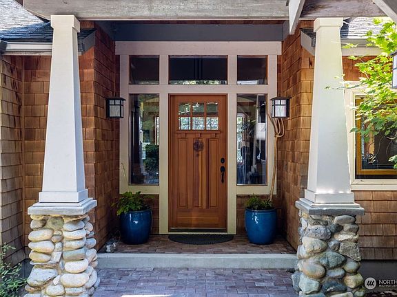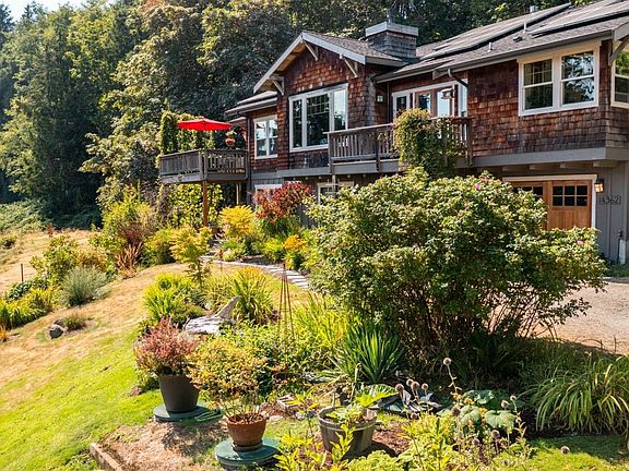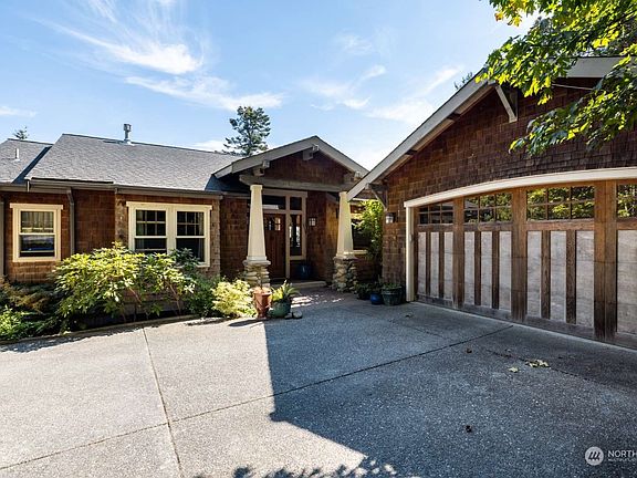 Craftsman home on .71 acres (two parcels) overlooking Similk Bay with views of Mount Baker from both levels. Open living area has vaulted ceiling, tiled fireplace and ocean-facing windows. Kitchen has 8-ft island and granite countertops; dining area opens onto large cedar deck. Primary suite on main has French doors to private deck, walk-in closet, en suite with soaker tub, shower, and dual vanity. Main level also includes office/bedroom with 2nd bath; bonus room; laundry room and pantry; two car garage. Lower level has two bedrooms, living room, full bath, and 2nd kitchen with separate entrance; used as AirBnB in past. Second garage on lower level is workshop/boathouse. Public beach is a short walk from property.