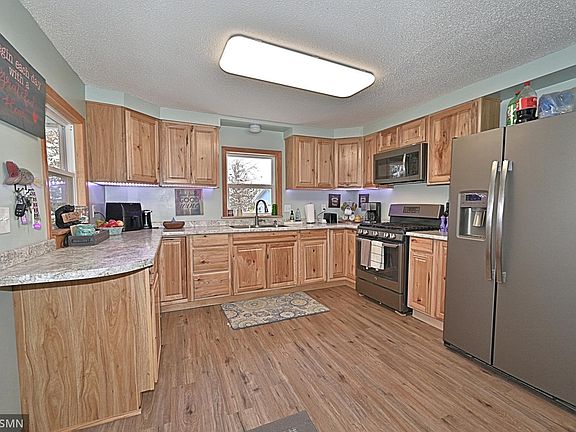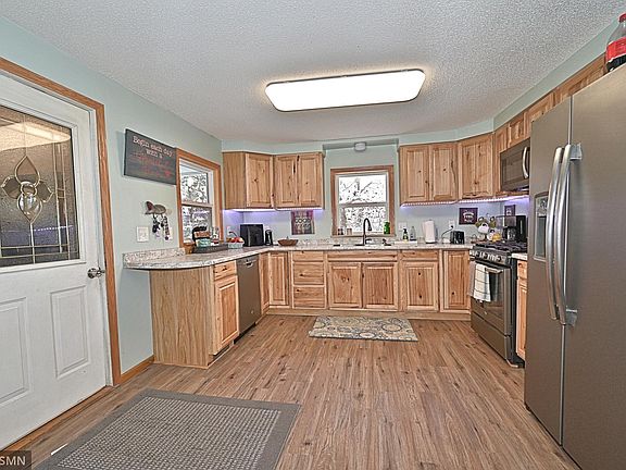 This 3 bedroom rambler on 2.89 acres has a lot to offer. Recent updated kitchen with hickory cabinets and matching LG appliances, flooring, windows, furnace and more. Basement is mostly unfinished and a great equity builder. Single stall insulated garage attached with a large breezeway. The second 2 stall garage is on slab and the driveway is tarred. Come check this out!