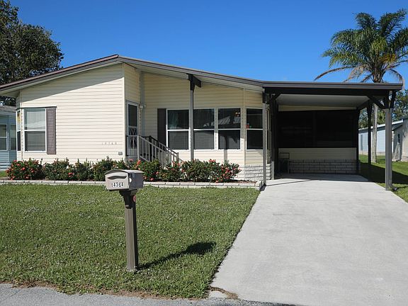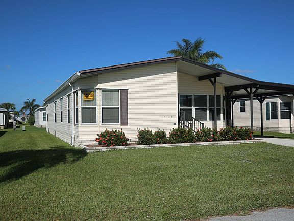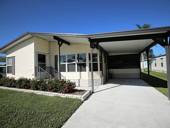 2 BED 2 BATH HOME IN SPANISH LAKES FAIRWAYS 55+ Exterior features: Driveway, carport, well-manicured lawn, storage shed with workshop, 2012 air conditioning system, fully enclosed Florida room. Kitchen: Laminate flooring, windows for natural lighting, lots of cabinets for storage, double stainless-steel sink, new dishwasher, ceiling fan with lights, smooth top stove with exhaust fan, refrigerator and freezer with ice maker and microwave. Dining room: Carpet flooring, built in hutch for storage, ceiling fan with lights, French doors leading out to the enclosed Florida room. Living room: Extra large living area with lots of space, carpet flooring, ceiling fan, entry door from the front of the house. Enclosed Florida room: laminate floors, fully enclosed, window treatments throughout for added privacy and shade, entry door from outside and French doors leading inside the home. Guest bedroom: Carpet flooring, ceiling fan, walk in closet for storage. Laundry room: Laminate flooring, washer and dryer, cabinets for storage. Guest bathroom: Laminate flooring, sink with storage, one piece shower tub with glass sliding door. Master bedroom: Carpet flooring, ceiling fan, extra-large walk-in closet for storage. Master bathroom: Tile flooring, garden tub, vanity with storage, walk in shower with glass siding door. CABLE: Comcast, Direct TV WATER AND SEWER: On site water and sewer utilities ( reverse osmosis ) ELECTRICITY: Florida Power and Light APPLICATION REQUIREMENTS: Able to show three times the amount of the lot rent , no pets, and must be 55+. AMENITIES: Pool, sauna, fitness room, library, billiards,craft room, bocce, shuffleboard, pickleball, tennis and an 18 hole golf course. SPANISH LAKES is a friendly 55+ active community, quiet location, with easy access to I95. Fort Pierce is located on the Treasure Coast and is a 15-20 minute drive to the beach. Close access to shopping , restaurants , and much more. Come and see for yourself....