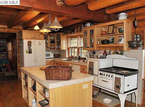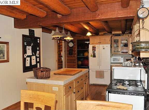 Delightful white pine log home with great floor plan on pretty tree covered parcel in Nevada City. Covered porch, doug fir floors & open beam ceilings. Country kitchen and lots of generous rooms for lots of rooms for a big family. Home shows beautifully and needs some work but financing is available thur a Home Styles Renovation Loan for repairs. Great potential! Magical home in the moutains!