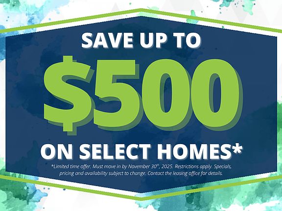 - Special offer! Save up to $500 on select homes! *Limited time offer. Must move in by November 30th, 2025. Restrictions apply. Specials, pricing and availability subject to change. Contact the leasing office for details.