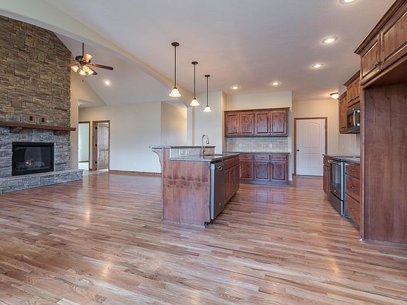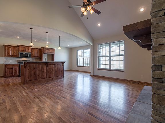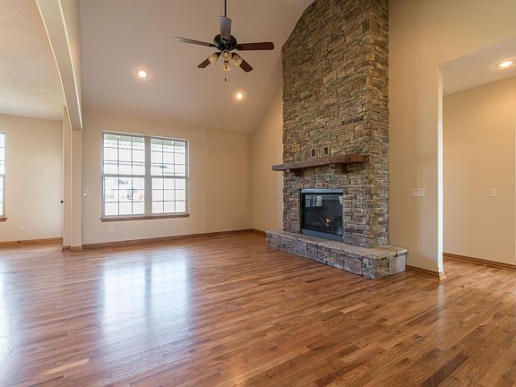 Beautiful home built in 2017 with 4 Bedrooms (split plan), 2 and 1/2 Baths in great 1908 SF m/l living area with 3 car garage. Brick and stone front with board & batten side & rear. Fully landscaped sodded yard with installed sprinkler system for easy maintenance. Oak hard wood floors with wood base trim throughout house. Carpet in 4 bedrooms and tile in two bathrooms, laundry & pantry rooms. Floor to ceiling Fireplace with beautiful mantle in Great Room.Custom alder wood cabinets with granite counter tops in kitchen and two full Bathrooms. Nine (9') foot ceilings throughout house with 14' catheral in Great Room. Ceiling fans with lights in all rooms. Higher quality GE Slate finish appliances. Garage and garage doors are insulated. Olde Town Kerr Place convenient to High School & shoppin