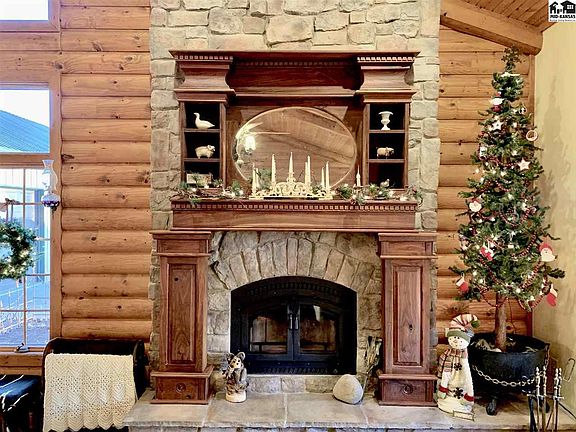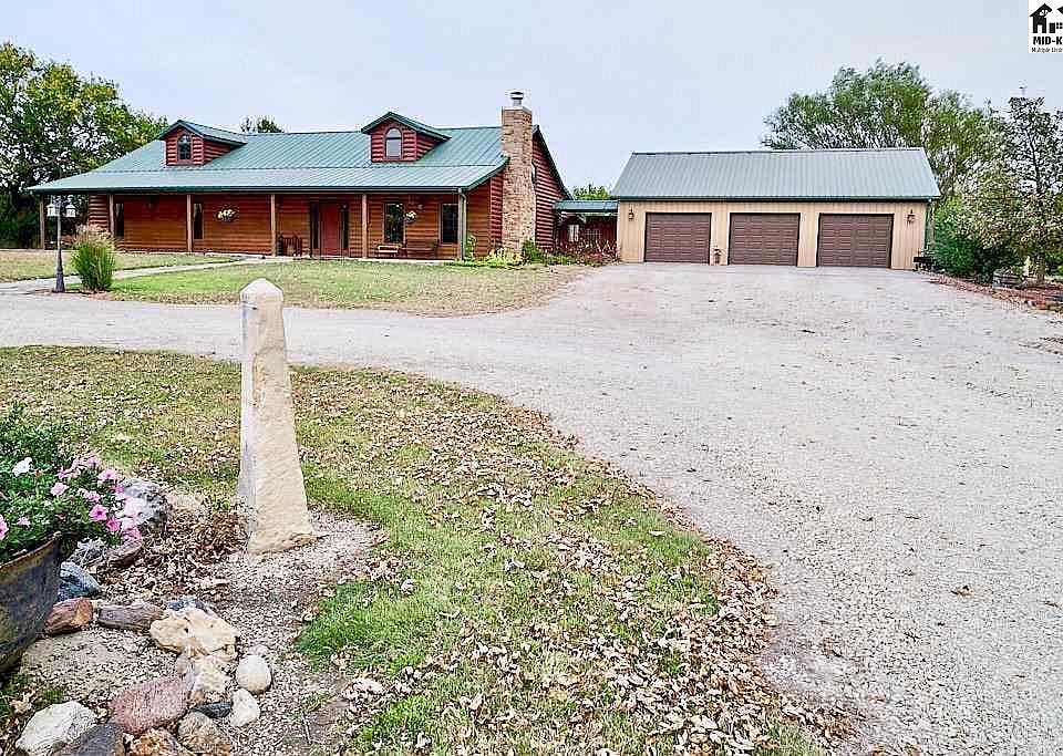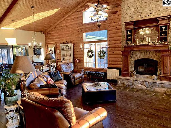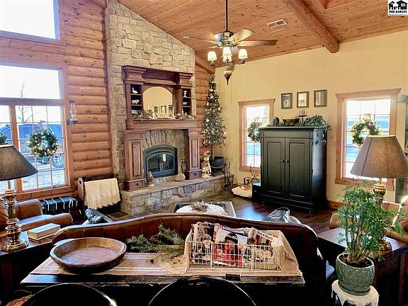 Nature has a way of letting itself into this gorgeous log cabin home that sits on 8.2 acres. It features spacious living areas that all overlook the floor to ceiling limestone fireplace and windows throughout that display the pond view and stunning outside panoramic views. The inspiring large kitchen has beautiful knotty alder cabinets and plenty of countertop space making family meals and entertaining fun. The abundant owner suite has wonderful closet space and doors that lead to the back sunroom. The owners bathroom features a large shower and a convenient washer, dryer area. The 2nd bedroom has an adjoining bath and bonus room that could also be used as an office, bedroom or nursery. You can stay warm and cozy on those cool mornings or evenings drinking your favorite beverage out in the full house length sunroom watching all the wildlife and enjoying a little bit of your own peace and quiet. Home is very efficient. It is all electric and is on the McPherson Board of Public Utilities. The 3 car 30x40 shop is heated and includes full bath, washer, dryer hookup and has 200 amp service. The 12'x35' RV pad with hookups is great for when family and friends visit. The 12x16 utility shed has electricity. The location is great its conveniently located 5 miles north of McPherson and 8.5 miles south of Lindsborg. Come take a look. It's beautiful!!!