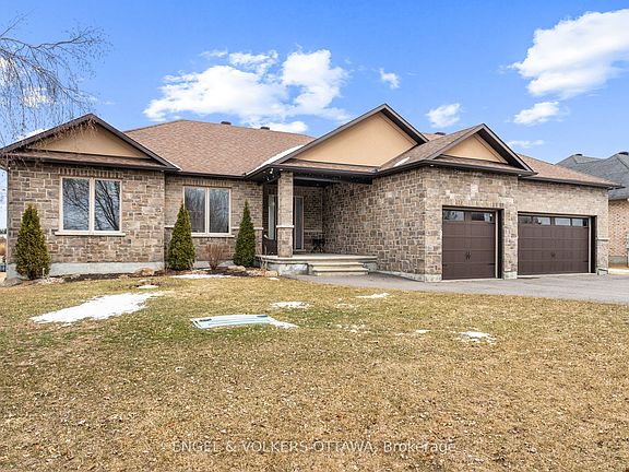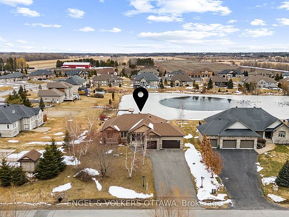 Located on a desirable waterfront lot in Greely's Water's Edge community, this John Gerard bungalow offers more than 3,400 sq ft of functional living space. Thoughtfully planned with quality finishes & beautiful views, the home provides a welcoming & comforting atmosphere. The open-concept layout begins with a bright foyer that leads into a spacious living area. Wide-plank hand-scraped flooring, a vaulted ceiling, recessed lighting, and detailed moldings add character, while a floor-to-ceiling stacked stone fireplace with custom built-ins serves as a focal point. The gourmet kitchen is equipped with double islands, granite countertops, a modern updated backsplash, professional-grade appliances & espresso shaker-style cabinetry. Overlooking the dining & living areas, it provides a practical space for both everyday use & entertaining. A nearby family entrance and laundry area connect directly to the heated 3-car garage. The main level includes three bedrooms, including an exquisite primary suite with a walk-in closet & an ensuite featuring a reclaimed wood accent wall, soaking tub, glass-enclosed shower, and dual-sink vanity with granite surround. A hardwood staircase with wrought-iron spindles leads to a quarter landing with outdoor access before continuing to the finished lower level. This space includes a recreation room with a fireplace, custom entertainment/wet bar, three additional bedrooms, a home office workspace, a 3-piece bathroom & workshop with access to the garage.Set in a sought-after, family-friendly community, this picturesque lifestyle is further enhanced by exclusive access to premium amenities with an annual association fee of $263. Enjoy beach access, tennis & volleyball courts, a dock for canoeing & paddle boating, plus skating in the winter! Conveniences also include being within walking distance to community parks, walking trails, nearby grocery store, shops, & restaurants! Experience the best of waterfront living in this exceptional home!