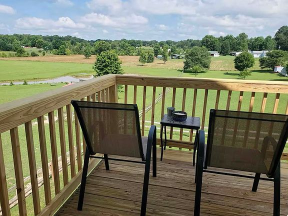 Two bedroom, one bath rental apartment sitting on the edge of a gorgeous 15 acre horse farm (you're only renting the apartment, not the 15 acres). It has a strategically placed porch offering breathtaking views of the sunrise/sunset, along with watching the horses and cows grazing below. It has central air/heat, city water, and comes almost completely furnished. This apartment is the top story of a two story garage/apartment building. Bottom level is only used for storage for the farm so you essentially get the entire place to yourself. Property owners live a short distance away.