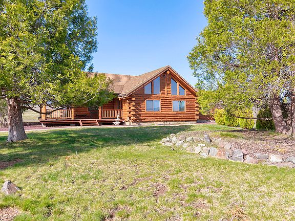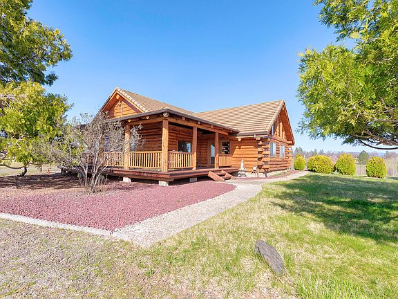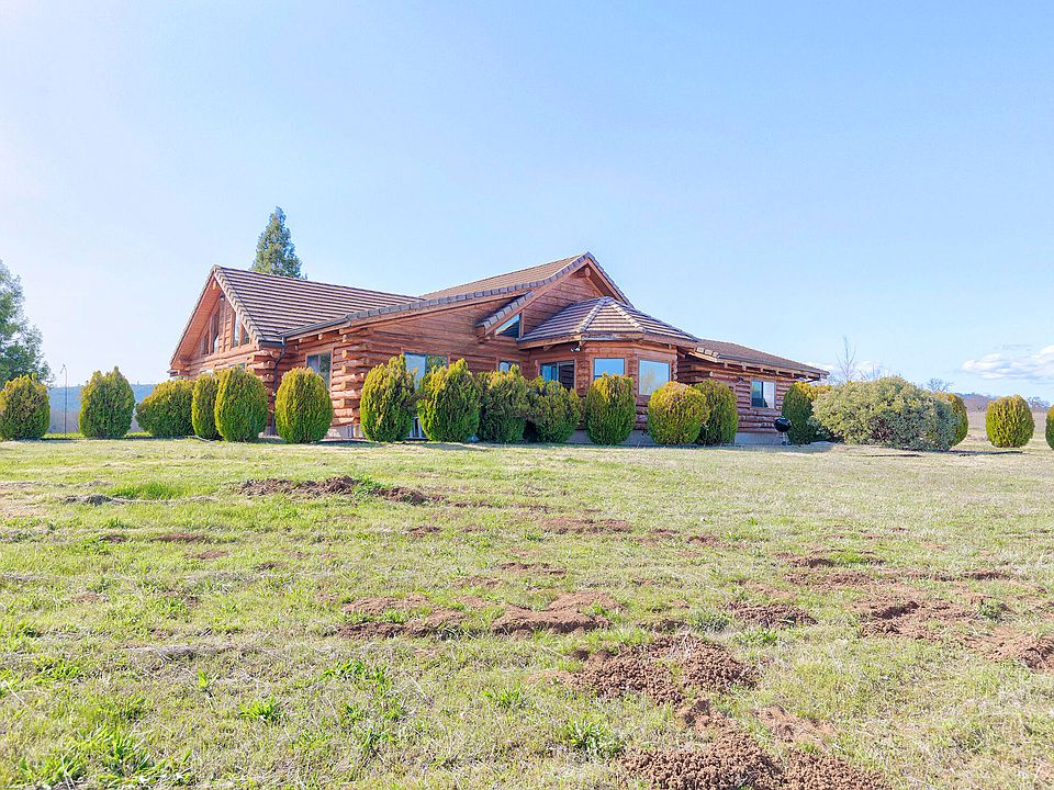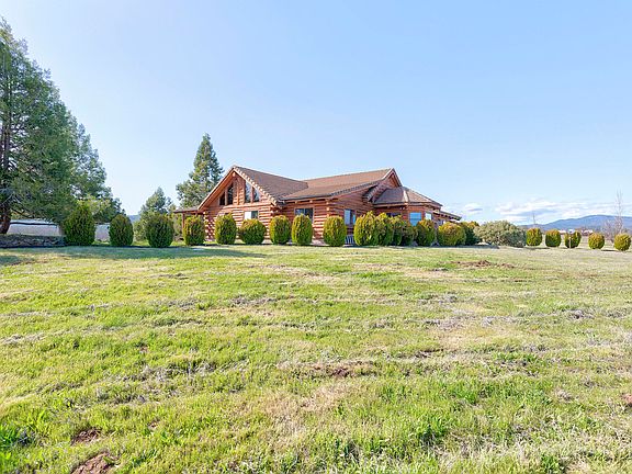 Custom built log home on 8.58 fully fenced acres. Abounding views of the Tablerocks, Mt McLoughlin and Mt Ashland. Attention to detail is apparent in this one of a kind home. Welcoming porch with open log beams , tongue and grooved ceilings, with views of open pastures and mountains. French doors lead into living room with vaulted ceiling and archway of natural logs opens into kitchen and dining area. The home has maple hardwood and italian tile floors. Kitchen has granite counters, pull out shelves, pantry, dining area plus a breakfast nook. Den/TV room is off of dining area. Primary includes soaking tub, walk-in closet, walk-in shower and french doors out to porch. 2nd bedroom is nicely sized. Front bath has walk in shower, tile floor and ample storage. Mature landscape with sprinkler system.