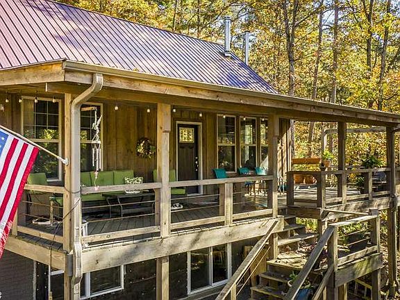 Two story cabin on 5 wooded acres with seasonal waterfalls and a stream running through the property. Main level has master bedroom with garden tub and 1/2 bath off the open livingroom/kitchen. Kitchen appliances stay, hand crafted kitchen cabinets, vaulted ceiling and woodturning stove. Metal roof, covered 34x10 front porch, must see to appreciate. Downstairs has 1BR/1BA, water dryer hookup, living room with another woodburning stove. Finished the downstairs and have a separate apartment.