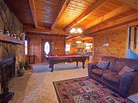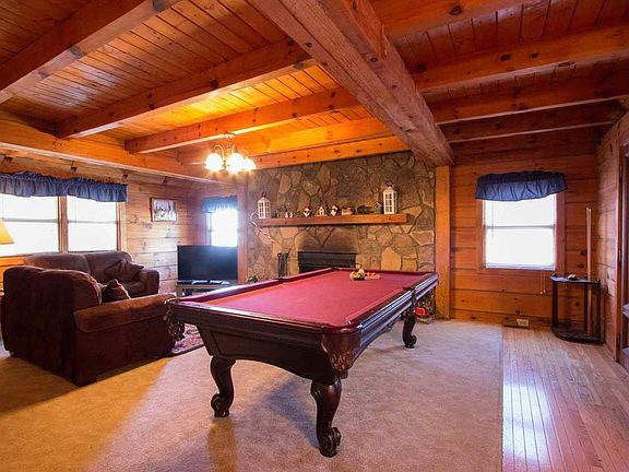 Experience the rustic side of Chalet Village in this log cabin just up the street from the South Clubhouse and Ober Gatlinburg. The great room has a large stone woodburning fireplace, cozy TV area, and a pool table for extra fun. The adjoining kitchen/dining area features custom-painted cabinets with natural wood countertops and a breakfast bar plus table seating for four. Off to the side of the kitchen stained wood folding doors open to reveal a full-size laundry facility. Around the corner is a ground-floor master suite that includes a luxury jetted tub in the oversize bath. Upstairs you'll find a second suite with an even larger bath that has a whirlpool and sitting area. Outside a full-length covered deck provides the spot for grilling, relaxing, and hot-tubbing! Log homes are desired by our rental guests, and at this price you can't go wrong ... schedule a showing to see this one today!