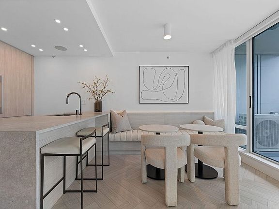 Custom renovated high-floor corner home at 'Azura 1'! Featuring permitted AC, a fantastic layout w/ flex + den, herringbone flooring, motorized blinds, & northwest exposure w/ city views. Extensive built-in millwork, ambient lighting & integrated speakers. Integrated fridge (water & ice) & dishwasher, AEG gas cooktop & oven, under counter microwave. Stone quartz counters/backsplash/waterfall & lounge-inspired banquette seating wraps into the dining area. Flex room off the kitchen is complete with built-in storage, while the stunning bathroom design features extensive wall-to-wall Italian textured tile, a walk-in shower w/ rain head & handheld, a floating vanity w/ medicine cabinet for extensive storage. The bedroom has a built-in headboard & walk-in closet. 1 Parking & tons of amenities!