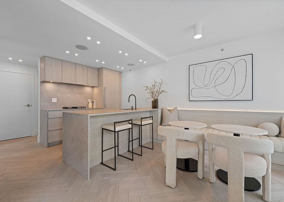 Fantastic layoutHerringbone flooringNorthwest exposureCity viewsExtensive built-in millworkIntegrated speakersIntegrated fridge