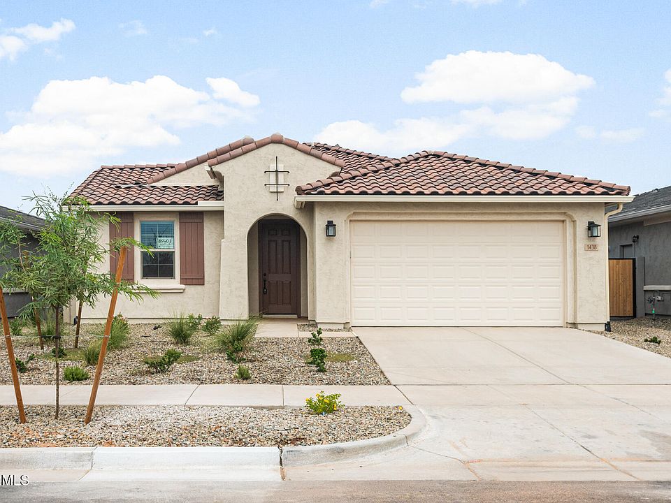 Almost ready for move-in. This single-story Barletta floor plan features 3 bedrooms + den and 2 baths. Enjoy an open layout with a center-meet sliding glass door in the gathering room, a chef's kitchen with stainless steel appliances, 42'' slate cabinets, and quartz countertops. Two-tone paint and upgraded flooring throughout. Washer, dryer, fridge, and blinds now included.
