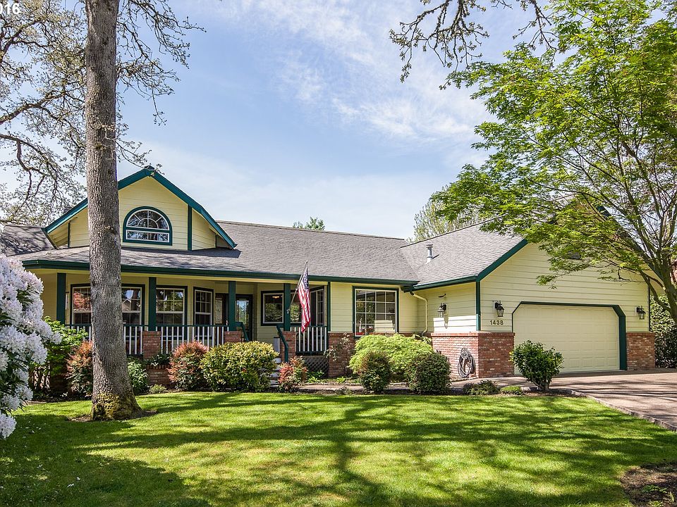 The wrap around front porch welcomes to a single level Oak Tree subdivision home. The kitchen features a new convection cook top, granite counter tops, oak cabinets, wood floors. The library/office has a vaulted ceiling and bay windows. The master suite has a soaking tub, see thru gas fire place and walk in closet.