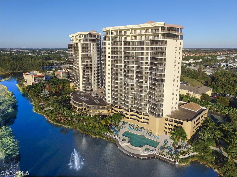 JR. PENTHOUSE -- TREMENDOUS POTENTIAL! These special condos on the 20th floor offer are unique since they have high ceilings, 2 feet higher than typical, bigger windows, taller sliding glass doors to bring the spectacular view in, crown molding and more. Currently under-utilized, there is so much a new buyer could do to make this a residence of distinction. The beautiful, rich wood cabinetry in the kitchen & granite counters would really be dazzling with stainless appliances & a nice backsplash treatment. Flooring is over-sized tile & wood surfaces. Very livable Great Room floor plan includes guest suite with ensuite bathroom, BR3 or den with a bathroom adjacent, spacious master suite opens to wide lanai and it is all in very good condition. At this price, you can add your personal customization and really have something spectacular! Riva is an upscale, secure community with beautiful amenities including a disappearing edge pool, very complete fitness center. Best of all is its ideal so. Ft. Myers location overlooking 300-acre Lakes Park with access to its walking and biking paths. A tranquil setting with restaurants, shops, beaches, airport just moments away. 2-car garage parking.