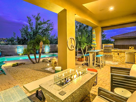 BEAUTIFUL MTN VIEWS. Tranquility within the confines of this backyard haven awaits you. Delight your senses with breathtaking sunset and mountain vistas. The southern orientation of the backyard captures the allure of city lights, creating a perfect setting to make the most of outdoor living possibilities all year round. The outdoor space boasts a heated salt water pool, fireplace, a built-in barbecue, and a refrigerator, providing the means to enjoy an exquisite outdoor dining experience. Bask in the enjoyment of a glass of wine within your own secluded courtyard, complete with a cozy seating area. Upon entering, you'll be welcomed by soaring vaulted ceilings, exquisite tile flooring, and a welcoming, neutral color scheme that instills a sense of belonging. The property boasts an inviting eat-in kitchen, a formal dining area, and a convenient breakfast bar. The kitchen itself is adorned with stainless steel appliances and a large kitchen island. Notably, the home includes the state-of-the-art Kinetico H2O softener system.