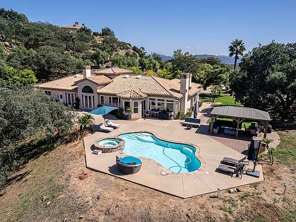 Serene, private, and tucked away in a gated community, this extraordinary Valley Center estate is a must see! Commanding fantastic views on a 4.8-acre lot 1,600 ft above sea level, this single-level ranch-style home features 3 bedrooms, 3.5 baths, and multiple entertainment areas across its approximately 3,427-sq ft layout. Explore the sophisticated, open-concept interior finished in easy-care tile flooring that gleams under high ceilings with gorgeous crown molding and recessed lighting. Graceful archways connect the main gathering areas, where custom picture windows and striking fireplaces with new contemporary steel metal doors are on display. Delight your inner chef with the updated kitchens top-notch Sub-Zero and Wolf stainless steel appliances, handsome cabinetry, and granite countertops. A sunlit breakfast nook is an excellent spot to sip your morning coffee, and the nearby wet bar is ready when you want a refreshing cocktail. Wake up to the sounds of chirping birds in the primary suite with a sitting area, outdoor access, and a dual-sided fireplace that extends its warmth to the luxurious 5-piece ensuite. Your backyard oasis invites you to unwind amidst a breathtaking mountain backdrop, soak up the sun in the pristine pool and spa, enjoy weekend BBQs under the gazebo, and listen to your favorite tunes on the whole-house sound system. Premium perks are paid solar, a Tesla wall battery, an alarm system, and security cameras. Savor this tranquil country lifestyle just 10 minutes away from downtown Escondidos conveniences. Come for a tour while its still available!