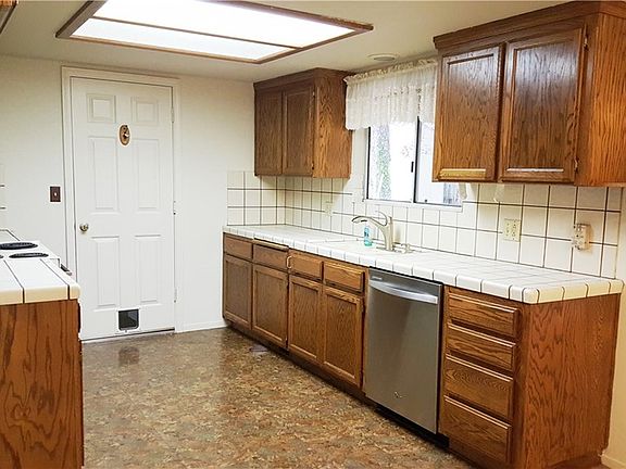 Wonderful, well-kept home with great curb-appeal. This home has a covered front porch, tile entry way and a spacious living room with large front bay window & free-standing Blaze King woodstove on a tile hearth that sits adjacent to the dining room and kitchen. The kitchen has new flooring, oak cabinets & tile counter, new dishwasher, electric stove/oven & an overhead microwave range hood. The dining room's sliding glass door opens to a large covered concrete back patio, easy care fenced back yard with a storage shed and concrete walkways along the sides of the home. The master bedroom has a large in closet and private bath, the guest room also has closet organizers and mirrored sliding doors. Both bathrooms have oak cabinets, tile counters and full tub/shower enclosures & newer flooring. All dual pane windows throughout with mini-blinds, ceiling fans with lights, new 6 panel interior doors and the heat & air unit was installed in late 2010!! This home is energy efficient, comfortable and offers a nice private back yard and low maintenance both inside & out!