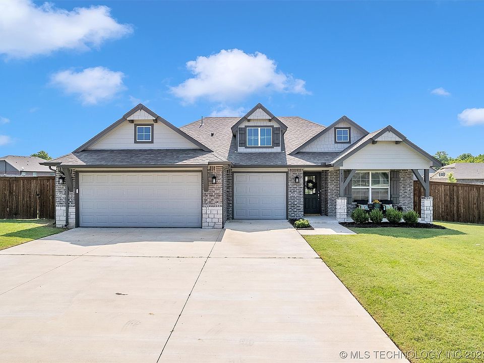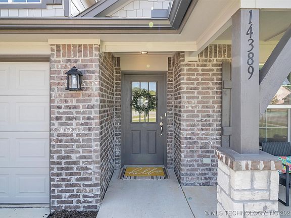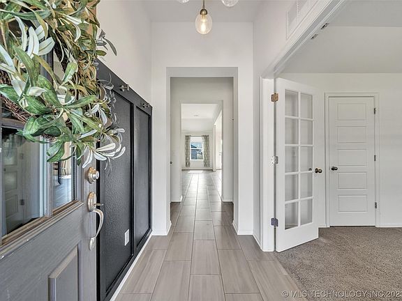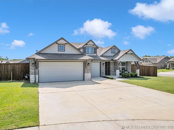 Adorable house in a lovely Bixby Neighborhood! The is a 3b with office or could be a 4 bedroom with 2 full bathrooms. The living room is large with a gorgeous unique wall that is a black wave pattern, decorative fireplace and open to the lovely kitchen with bar seating, large walk in pantry, dining area and large flat top island with sink. The bedrooms are a split plan with two secondary bedrooms on one side, along with a hall bathroom with shower/tub combo and the laundry room. Primary suite is on the opposite side off living room with a walk in closet and en suite bathroom with dual sinks, shower and linen/toiletry storage. The front bedroom is set up like an office with French doors, but could be a bedroom as it has a closet. Entryway has mudroom hooks built in and a door to the large 3 car garage with huge driveway! Corner lot, fully fenced and extended back patio, plus cute front porch overlooking the cul-de-sac completes this awesome house! Pine Valley also has a neighborhood pool right across the street, park and upkept entryway! Great community and home, all move in ready!