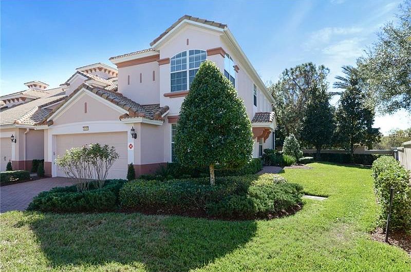 This spacious townhouse lives like a single family home. Enter from a private courtyard to this immaculate 3 Bed 2.5 Bath home and you are greeted by 20' vaulted ceilings and windows flooding the unit with natural light illuminating the rich laminate wood floors. The open floor plan is fantastic for entertaining! Kitchen features GE Profile appliances, large island, granite counters and eat in area. 1st floor master features a huge closet, soaking tub, and over-sized walk in shower. An upstairs loft can function as a media area or additional guest space. Unit also boasts a private 2nd floor nook making a perfect home office. Two spacious bedrooms with sizable shared bath round off the 2nd floor with remarkable closet and storage space. Bring the outdoors in by opening the triple slider to a screened lanai with very private and peaceful conservation views. The guard gated community of BellaTrae, including a 12,500 square-foot clubhouse that boasts a library ,media room, and pool tables.. The fitness center features cardio, strength-training equipment and spa like locker rooms. Enjoy BellaTrae's heated resort-style pool and spa, putting green, and bocce ball courts. As part of the larger Champions Gate community, residents enjoy the Champions Gate Village with grocery stores, banks, restaurants. Enjoy the facilities at the Omni Hotel along with their spa and two championship golf courses. Entertain the family easily as this home is located just 7 miles from Walt Disney World.