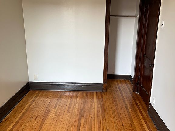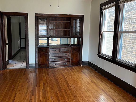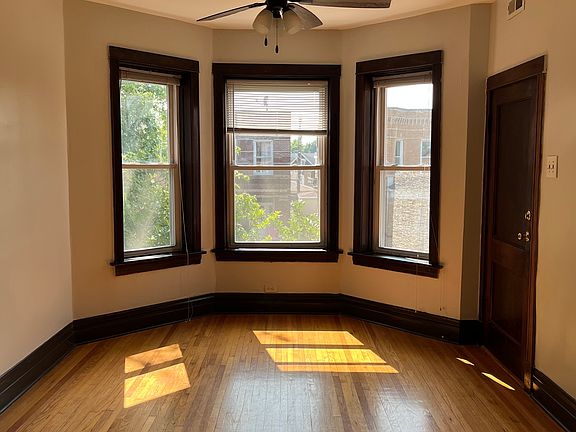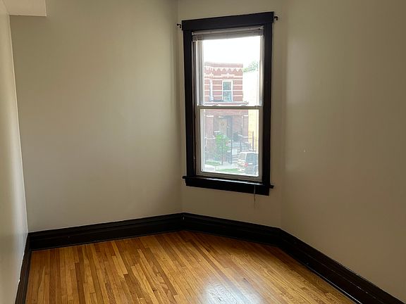 Two bedroom, 1 bathroom apartment with enclosed indoor back porch room. Full living room, dinning room and kitchen. Kitchen has microwave, stove and fridge. Hardwood floors throughout the apartment. Central heating and cooling. Recently installed new cooling system. Access to coin operated laundry machine in the basement. Full backyard. One parking spot in rear. Close to public transportation and 606 Bloomingdale Trail. Electricity and gas to be set up and paid by the tenant. No smoking allowed. No pets allowed. Thank you. Move-in fee is $600.