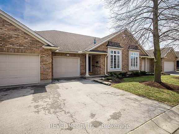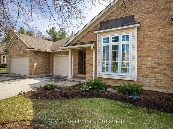 Welcome to this meticulously cared-for brick bungalow in Glen Brooke Estates, offering 1,360 sq ft of elegant main floor living in the heart of Niagara-on-the-Lake. The main level features a bright and spacious living room with cathedral ceilings and a cozy gas fireplace, a separate formal dining room, and a generous kitchen with Corian countertops, built-in dishwasher, and a charming dinette. Sliding doors lead from the dinette to a 20 x 12 wood deck, perfect for relaxing or entertaining. The primary bedroom boasts a walk-in closet and a private 4-piece ensuite. A second bedroom has been thoughtfully converted into a versatile den, study, or home office. There is also a convenient 2-piece bathroom off the dining room and main-floor laundry just off the kitchen. Direct access to the attached single-car garage adds ease and convenience. The finished lower level offers a large family room, a spacious guest bedroom, a 3-piece bathroom, and a substantial utility room with a new high-efficiency Lennox furnace and A/C. Additional features include a dedicated workshop, and storage area. Backing onto city-owned green space and a peaceful municipal reservoir fed by Four Mile Creek, this home combines natural beauty with low-maintenance living. Condo fees cover all exterior maintenance, lawn care, snow removal, building insurance, water costs, Bell Fibe Internet & TV. This well-maintained one-story townhome complex is highly sought-after in the vibrant community of Virgil.