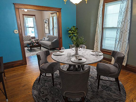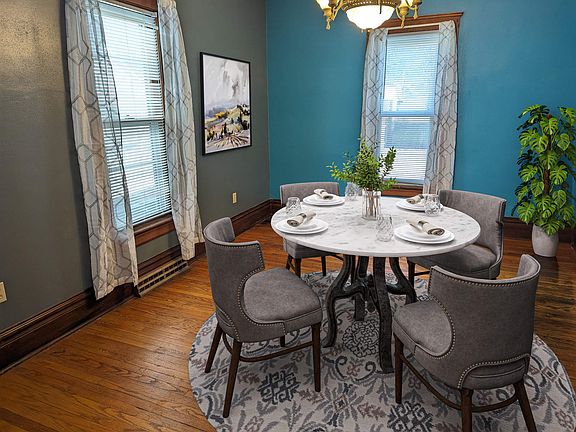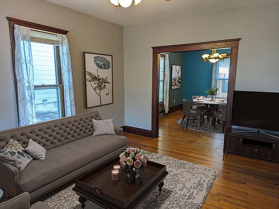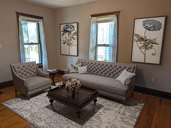 This move-in ready home boasts updates while maintaining the charm of its original hardwood features. The main floor offers a living room, a bedroom/home office, a dining room, a kitchen, and a great enclosed back porch mud room. You'll find a generously sized detached 4-car garage, measuring 40' deep and 24' wide. Upstairs, there are two spacious bedrooms, each with two closets, and a full bathroom. The roof was a complete tear off new in 2014. Enjoy relaxing on the covered front porch, measuring 20' x 7'. The backyard is spacious, spanning 185' in depth. Some of the furniture may be virtually staged, no alterations or changes to the home!