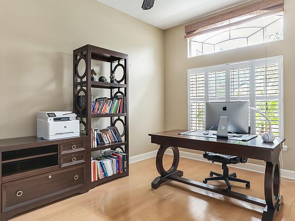Beautifully cared for with many upgrades*3-way split plan floor plan with both formal informal areas + office, family room + rear bonus/media room*Beautiful wood floors in office, family room, nook & kitchen* Tile floors in foyer, formal living & dining room & bathrooms*Granite counters in kitchen, maple cabinets, new gas range (2017), bosch dishwasher & center island*Nu Flame vent less (Ethanol) fireplace surrounded by stone accent wall in family room + smart TV that can stay with home*Plantation shutters, built-in entertainment center in bonus/media room, ceiling fans, central vacuum, crown moldings and glass front door*Large screened lanai and beautifully landscaped yard to enjoy with the travertine patio & Pergola!