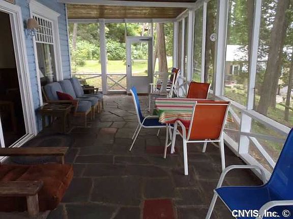 5 bedroom seasonal cottage fully furnished with screened in wrap around porch. Wainscoting throughout. Hardwood floors. Updated kitchen with tons of cupboard space and dishwasher. Wood burning fireplace. Breezeway leading to Granex which has a full bath, laundry facility and bedroom. Patio area overlooking lake. Formal dining room with monitor heater. Double lot which has a fireplace ring and a shed and very large dock with excellent swimming area. Fabulous view of much of the lake and spectacular sunsets. New driveway which leads directly to cottage. No Stairs!! Very easily accessible.