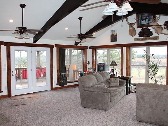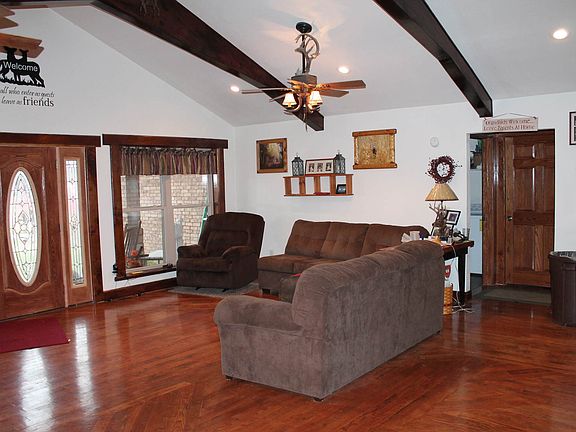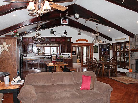 519 Acre Ranch with an absolutely beautiful 2013 Handicap Assessable Custom home with 3 bedrooms, 3 bathrooms, and an attached (fully insulated) 3 car garage, plus a 2nd home. This home is brick w/a concrete parking area ,3 patios, 2 are covered. 2 of 3 bedrooms have trey ceilings and French doors to their own cabana deck. The master bathroom has a jetted garden tub and a stand alone shower. The 2nd bedroom is quite exceptional and would qualify as a master bedroom in many homes, it's bathroom has a step in sitting shower for easy use. All the shelves, cabinets and (floor to ceiling) efficient windows are finished in native walnut and give the comfort of a lodge. 8 Birch beams fit nicely on the cathedral ceiling in the great and family room. Canned recessed lighting and 9 ceiling fans are throughout the home, with another fan in each cabana deck outside. Any party would be supported by the "great room" (open living, dining & kitchen area) and the family room with French doors to each deck. All the doors inside and out are 36 inches. The home has 2 furnaces and fireplaces on each level. The basement is framed & wired for each room, in prep for finishing. The second home has it’s own setting with 2 bedrooms, 1 bath and a glass enclosed porch across the front. This 1446 square feet home was built in 1989 and remodeled in 2004. There are 2 buildings on the property. The 40x80 barn as you come into the property was built in 2013. The 72x64 foot barn near the 2nd residence was built in 2005
