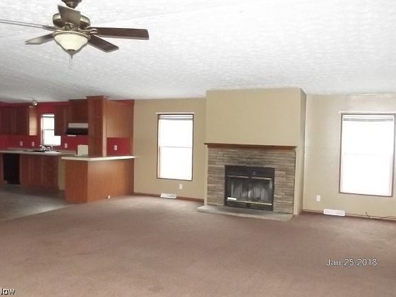 Large Modular on 3.38 acres. Open floor plan, large rooms 4 miles outside of Carrollton and Dellroy. Fireplace on living room open to kitchen. Master Bedroom with walk in closet and bath with double vanity, garden tub. first floor laundry.
