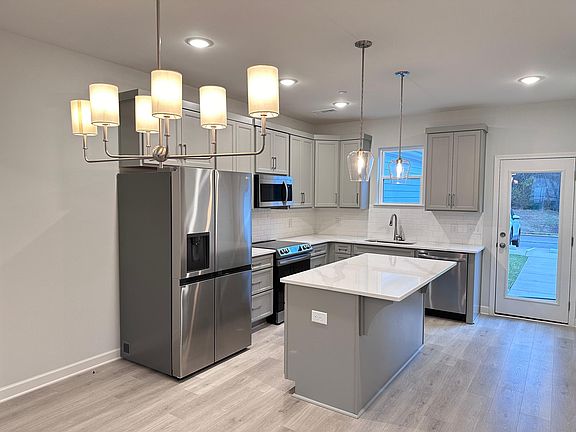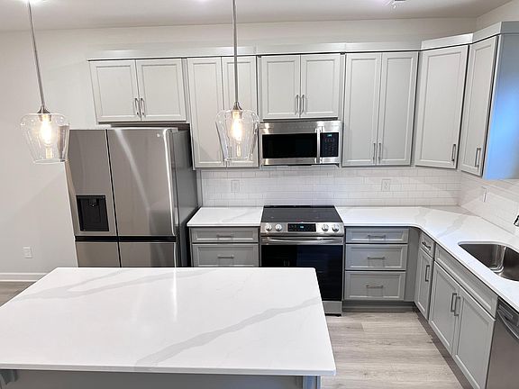 Stainless steel appliances complete the modern kitchen setup