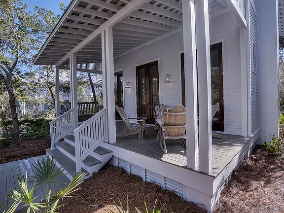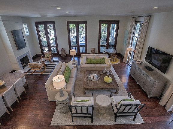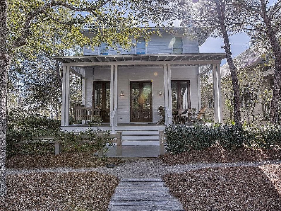 This professionally decorated, fully furnished home features an airy contemporary coastal design throughout. Ideally located on a large corner lot in WaterColor's Phase I Park District, this property is just steps to the WaterColor Beach Club and town center. This thoughtfully designed home offers a main residence and a detached carriage house with 2 car garage and separate living quarters above. The main home features hardwood flooring throughout, a spacious great room with soaring ceilings, floor to ceiling windows, a cozy fireplace, large dining, gaming area and kitchen with ample storage that opens to the screened in outdoor dining area,. The second level is highlighted by two spacious master suites with private baths, an additional bedroom and a full bathroom. The carriage house
