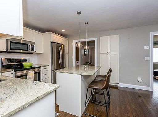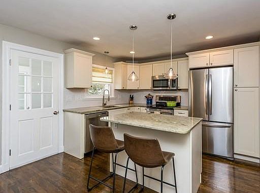 - Kit Dscrp: Pantry, Flooring - Hardwood, Countertops - Stone/Granite/Solid, Stainless Steel Appliances, Recessed Lighting, Remodeled, Exterior Access, Lighting - Pendant