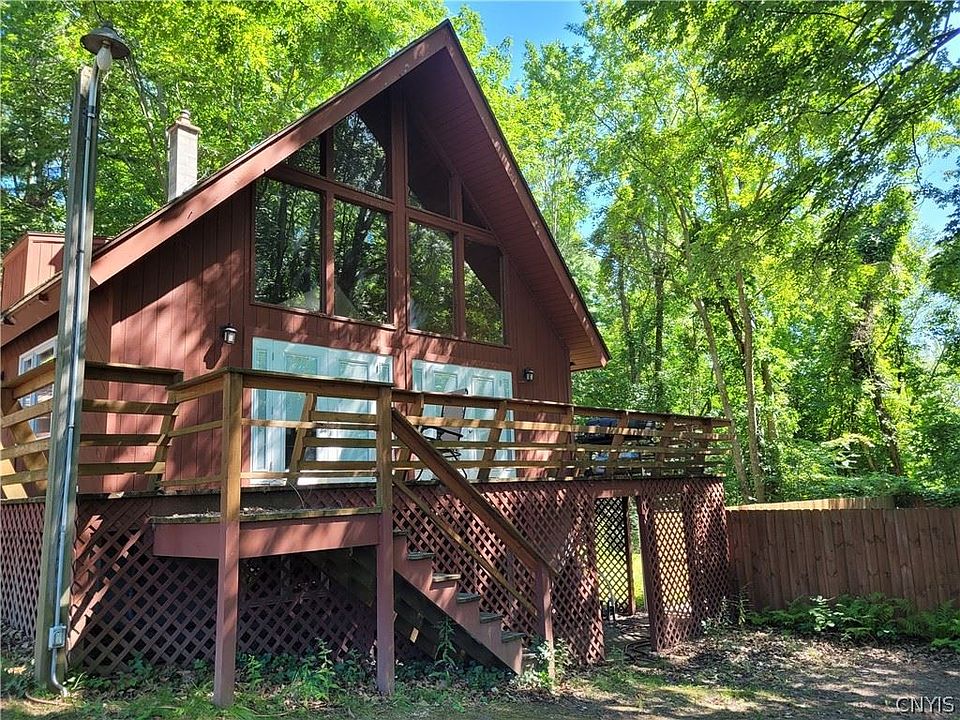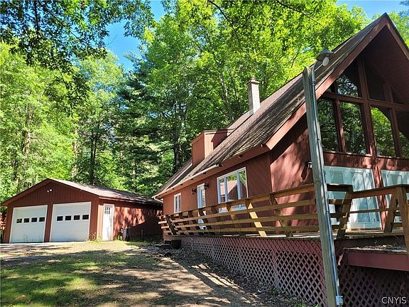 Tranquil Property on 2.3 Acres with a Two-Car Garage & In-Ground Swimming Pool. This 3-bedroom, 2-bath home was completely renovated in 2017 & includes a wrap around deck & an open floor plan w/ sunny, floor-to-ceiling windows that overlook the surrounding woodland. Updated kitchen has stainless appliances & a center island with Silestone countertops. The dining area contains French doors to the deck w/ a stunning view of the pool. Living Room offers vaulted ceilings and an open staircase to the 2nd floor primary bedroom suite & a loft with an incredible view of the leaves in autumn or the spring garden. 2 more bedrooms on the first floor. Extra large bonus room downstairs provides space for exercise equipment, a library or media center. Just bring the large screen TV & the popcorn. Lower level contains a laundry & sliding glass doors to the pool. The partially fenced yard provides a storage shed as well as land to set up a picnic table & a fire pit for visiting with friends & family. Enjoy the peace & quiet of nature, snow mobile or simply watch the birds & deer from the floor to ceiling windows. Make an offer today and be able to spend the holidays in your new home.