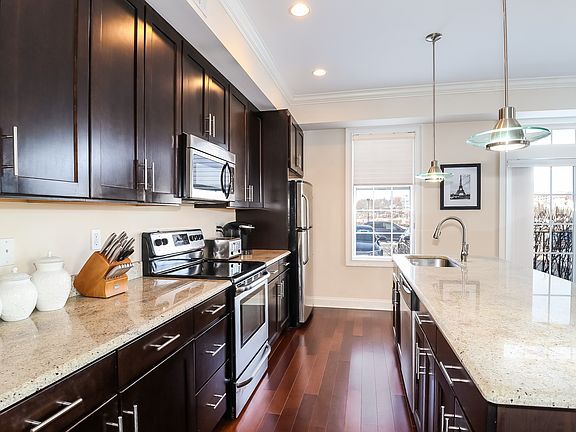 Luxury Riverfront living at the Marquis! Captivating first floor unit featuring oversized windows, dramatic open floor plan and sun flooded rooms. Gourmet kitchen showcasing rich wood cabinetry with sleek espresso finish and stylish nickel hardware, stainless steel appliances, granite countertops and a large center island breakfast bar with modern pendant lighting and seating for up to four. Dynamite open concept living and dining areas feature 9ft ceilings, recessed lighting, crown and base molding, lustrous hardwood flooring and a Juliet balcony which opens to capture fresh harbor breezes and natural scenery. Two generous sized bedrooms, both with sumptuous en-suite baths and plush wall to wall carpeting. Master bedroom also includes a spacious walk-in closet. This home also offers a nicely appointed powder room, coat closet and a laundry room with full sized stackable washer/dryer with freestanding storage closet. Pristine well maintained building provides an assigned parking space, secure private storage unit, gorgeous billiard room with flat screen TV and separate fitness center. Indulge in the waterfront lifestyle offering a serene tree-lined courtyard and nature trail bordering the Norwalk River. Convenient location just minutes to I95 and Metro-North train, shopping and restaurants. Mounted flat screen TV in living room, strorage cabinet in laundry and hallway shelving included in sale.