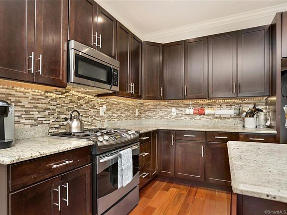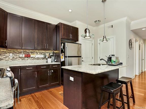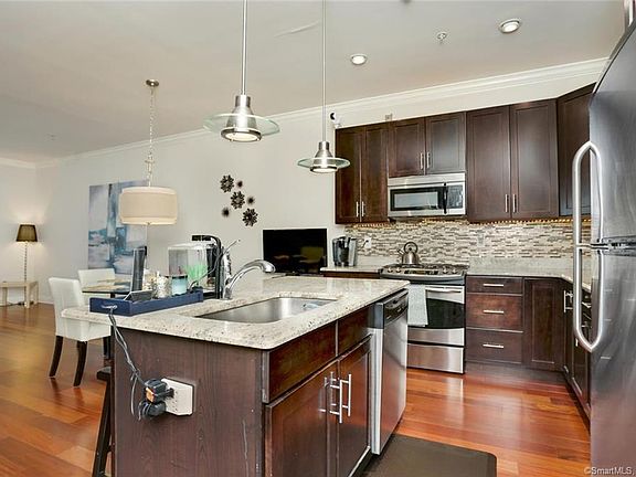 Spacious, open, airy and quiet condo. Just shy of 1500 sq ft - the unit has a large, light, open airy feel. Massive master suite with 2 closets (1 walk-in) and an en-suite master bath. Views of the river from the master. Second bedroom also has an en-suite full bath + large closet. Open kitchen, dining and living area with stainless steel appliances, gas range, granite counters, 9 ft ceilings, crown moulding and beautiful hardwood floors. LOTS of storage space. BRAND NEW GE WASHING MACHINE in the units' laundry room + dryer. Half bath off kitchen. Storage unit, GYM and club room in the elevator building. Easy access to walking path along the Norwalk River. Convenient to EVERYTHING - 95, train, Stew Leonards, SoNo, coming Nordstroms and Bloomingdales, restaurants, museums, beaches and parks. Easy, modern living at its finest!