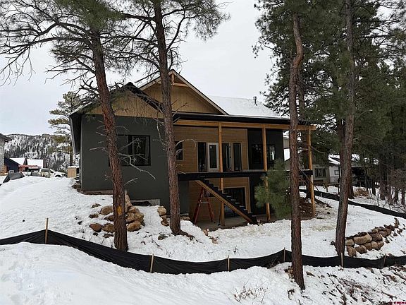 This luxurious Craftsman style house in Edgemont Meadows exudes Colorado living in the tall pines. An expansive 2,488 square foot home welcomes you in through the covered patio and alder wood door that leads you into the common living space. The living room features a contemporary fireplace and is open to the dining room and kitchen. Large windows and full glass french doors to the large covered back patio fill the space with natural light. The kitchen is equipped with stainless steel appliances, a vented hood, microwave, quartz countertops, LED under cabinet lighting, soft close drawers, floating shelves for easy display, a pantry, and an island for added counter space and bar seating. The primary suite is tucked away for added privacy and located on the main level for convenience. It has a ceiling fan, gas fireplace, and a door to the back deck. The ensuite bath offers a dual vanity with quartz countertops, ceramic tile floors, tiled shower with a glass door, and walk-in closet. Engineered wood flooring will guide you to two additional bedrooms, each with ceiling fans, and a shared full bath. Downstairs, there's a TV room, bedroom, full bath, and patio which connects to the main level deck as well. Back on the main level, an office space is next to the laundry room complete with cabinetry, quartz countertop space, and a dog wash station. A door will open up to the three car garage which is ideal for additional storage, vehicles, and work space. This home comes with added finishes for easy living including A/C condenser, smart thermostat, keypad on the garage door, screens on all the windows, two frost freeze hose bibs, and a sump pump in crawl space. To accompany the high quality finishes inside, the exterior is not missed with beautiful landscaping equipped with a Rainbird System. Edgemont Meadows is the newest addition and offers amenities such as trails, neighborhood market, and Florida River access within 10 minutes of downtown Durango.