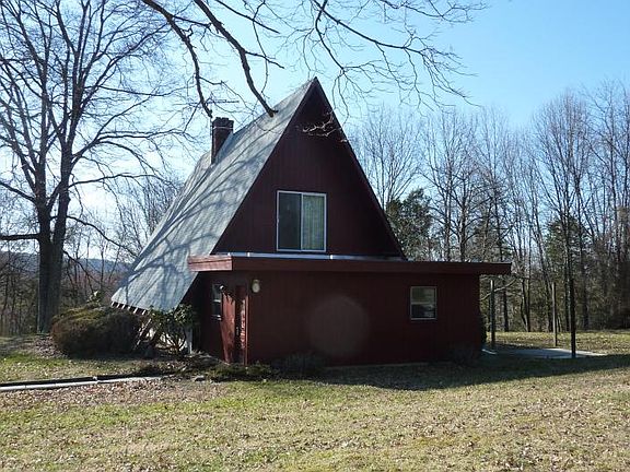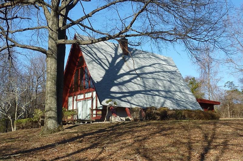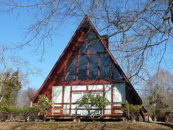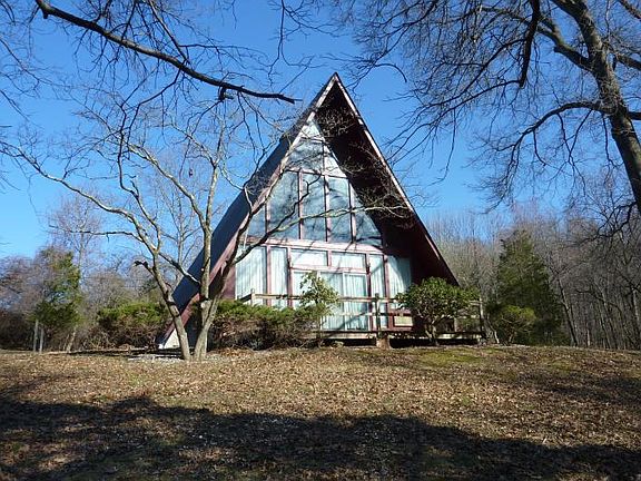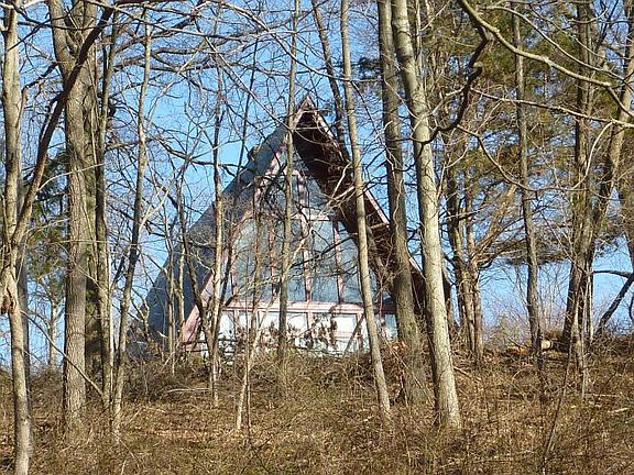 Total privacy assured in this dramatic A-Frame home situated on wooded 7 Acs. set back from the road. Features a two story family room with a wall of windows & wood burning fireplace.