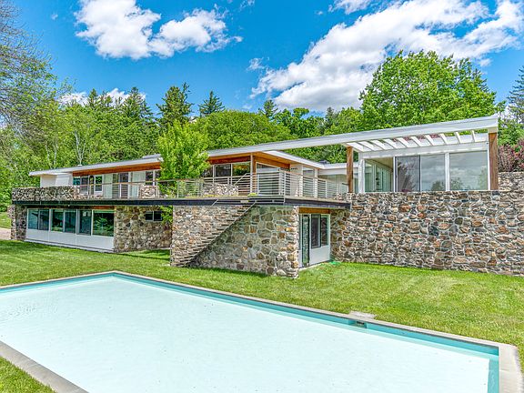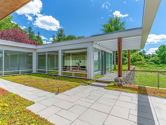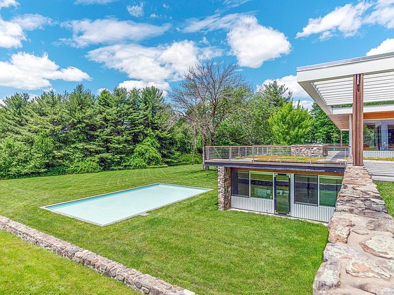 Designed by legendary Bauhaus architect Marcel Breuer, Gagarin I (1956-57) is Litchfield's most monumental Modernist residence, epitomizing the perfect marriage of art, design, and luxury. Here is a rare opportunity to own a historically significant home that clearly articulates the simple and streamlined ideals of one of the 20th century's most influential architects.Elegantly nestled into a hillside with the aid of bluestone terraces and original stone walls, the residence has been meticulously restored and upgraded with great care and sensitivity towards its origins -- integrating every 21st-century comfort. With elevated views of the countryside, the two-story home offers the most pronounced relationship between exterior and interior living spaces of all Breuer designs, with multiple terraces, enclosed courts, and even an interior greenhouse that is an integral part of the living room.Both inside and outside the house is a rich juxtaposition of natural materials. The angled entrance area, the hallway leading to the master bedroom wing, and a part of the living room are paved with brick; the rest of the flooring is reclaimed teakwood. Ceilings throughout are textured Portuguese cork that transitions seamlessly to the underside of the exterior roof overhangs.The main level is comprised of an immense (35'x52') glass-walled living room fronted by a long bluestone roof deck with areas for dancing and dining overlooking a reflection pool and expansive lawn. The main space features Breuer's signature bush-hammered concrete fireplace -- a tree-like sculptural focal point that branches off into sensual curves -- beyond which is an interior greenhouse and an uninterrupted expanse of windows affording south and westerly views of the hills. As with all Breuer-architected homes, the living and dining areas act as one expansive space, with the kitchen part of that space. With Gagarin 1, the kitchen space is as distinct as its design, situated in what is in effect a separate wing with en suite guest rooms, pantry, and storage room.The master bedroom suite is privately situated in a projection off the main volume of the house in a separate wing, complete with its own gas fireplace, dressing room, and a large private courtyard. Adjacent to the master bedroom is a glass-walled sitting/game room/study that opens to an elevated flagstone terrace with sunset views.Marcel Breuer's signature floating staircase with its parapet of abstract geometric cutouts, leads you downstairs, which becomes grade level at the rear as the house is built into a hillside. Along with a wet bar and laundry room, there's a large open space with bonus room -- formally known as the children's living room -- containing a wood-burning fireplace and direct access to the grounds and pool. What was once four children's bedrooms, is now a massive windowed workshop and artist's studio with garden access. There's also direct access to the attached three car garage.The exterior is a sensory treat of varying materials, sun control devices, terraces, and solid and glass planes. Both front and rear of the home are marked by sun-shading overhangs, bending light and casting shadows that change the facades throughout the day. The effect is about as close to decorative effect as Breuer ever got. A Ginko tree that was intentionally planted grows through a large cutout in the first-floor terrace. Fieldstone walls and teak-capped railings trace portions of the elevated terraces, while tall and dramatic fieldstone walls at ground level eventually recede into the ground. A stairway, with its riserless treads cantilevered from the fieldstone wall, leads to the reflection pool. These stairs and the sculptural railings reveal Breuer's early prowess as a furniture designer.An Exciting Piece of History That Has Been Well Documented. The home retains many of the original details and fixtures including the expansive glass sliders on Torx bearings, bathroom sinks, skylights, and built-ins. Over 900 documents consisting of letters, drawings, photographs, and other materials related to Gagarin I are available at the Marcel Breuer Digital Archive at Syracuse University.Gagarin I is located in a serene, very private and natural 1.7-acre setting with protected views in the beautiful Litchfield County Hills (CT.) within walking distance to the quintessential Litchfield Green and about an hour and three quarters from midtown Manhattan. The nearest airports are (private plane) less than one-half hour and (international) about an hour.